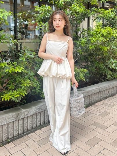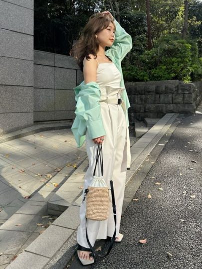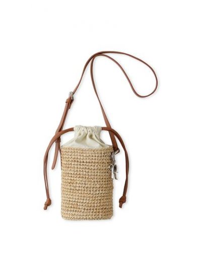 季節感溢れるペーパー素材のバケットバッグに、合皮をMIXすることでほんのり辛口に引き締め。ワンポイントに加えたチャームもポイントです。巾着付きなのでバッグの中身が見せずに収納できるので安心感もあり♡