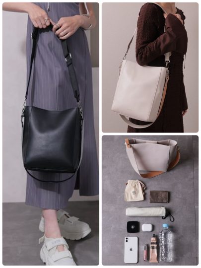 ペットボトル、折りたたみ傘がすっぽり入るサイズ感で通勤からオフまで大活躍。長さが調整できるベルトとバイカラーのフェイクレザーベルトの2種類がセットになっていて、気分やコーデに合わせてアレンジ可能です。