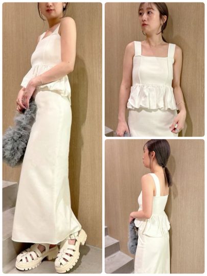 こちらはワンピ見えする、Iラインスカートとバルーンペプラムビスチェのセットアイテム。ビスチェは柔らかな糸をミラノリブで編んださらりとしたニット生地で、ギャザーを寄せたペプラムシルエットが目線をあげてスタイルアップ効果も期待できます。スカートは身体のラインを拾いにくいストレッチ感のある布帛生地を使用。着回し力の高いシンプルなデザインは単品使いも万能!