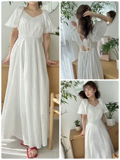 フェミニンムード溢れるロングワンピースは夏の制服に。ラグランスリーブと裾にかけてたっぷりのボリュームを持たせたフレアが、華やかで女性らしいシルエットを描きます。華奢なリボンをあしらったバックルスタイルでヘルシーな肌見せを演出。リボンを調整することで、背中の開き具合とウエストの絞り加減がアレンジできます。うっすらとプリーツをかけたシフォン生地もさらっと爽やか。