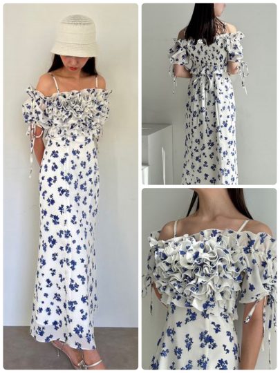 ボリュームフリルをたっぷりあしらった、1枚で華やかなロングワンピース。肩を落としてデコルテを魅せて着るデザインです。袖はポワンと膨らんだパフスリーブが女心をくすぐります。シボ感のある生地に、爽やかな花柄は見た目も着心地も軽やか。後ろにはゴムシャーリングが施されているので、美シルエットで着ていただける一品です。