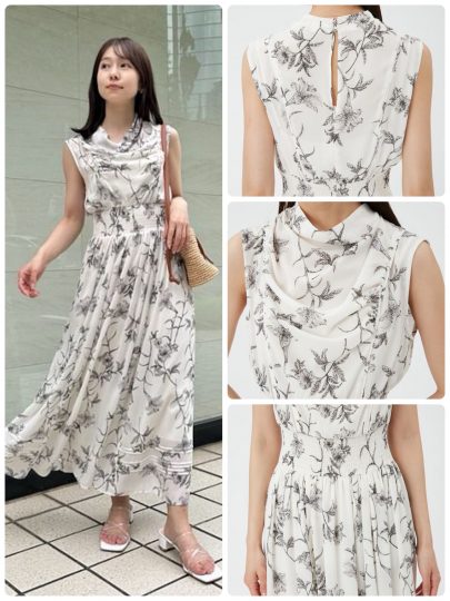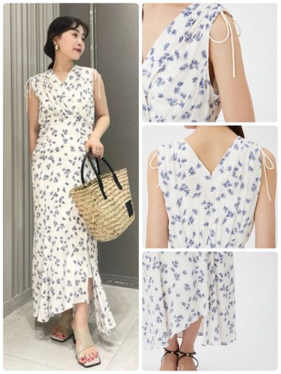 アイボリーホワイトをベースに、ヴィンテージライクなリーフ柄が舞うデザイン。華やかな印象を引き立てるのは、肩の華奢なリボンから繋がるように入れたタックギャザー。デコルテやお顔周りが美しく見えるカシュクールデザインも女性らしさたっぷり。裾にはフロントスリットを入れて、夏らしい軽やかな雰囲気が香ります。