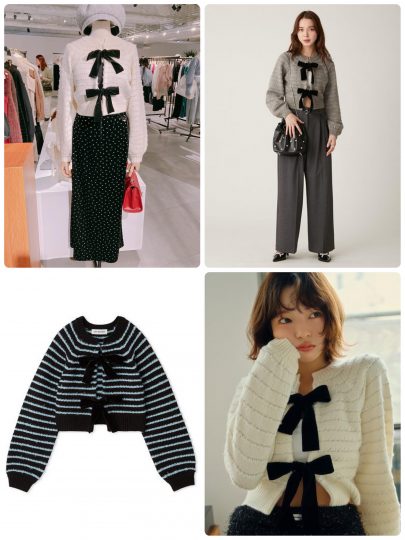 ベロアリボンが主役のカーデはボリュームスリーブでコンパクトなシルエット。