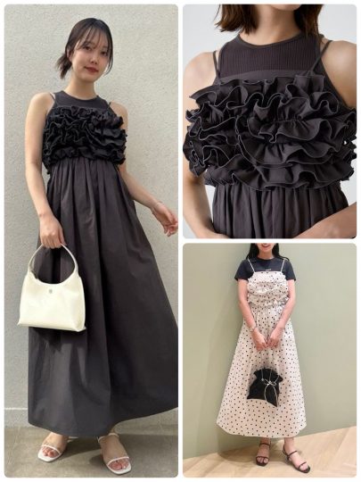 着回しがきくアメスリカットタンクと華やかなボリュームフリルを胸元に施したギャザーワンピのセット。ワンピはバックオープン仕様なので、お手持ちのベアトップと組み合わせて肌見せするのもおすすめです。