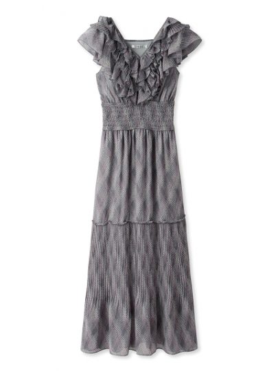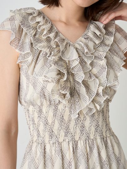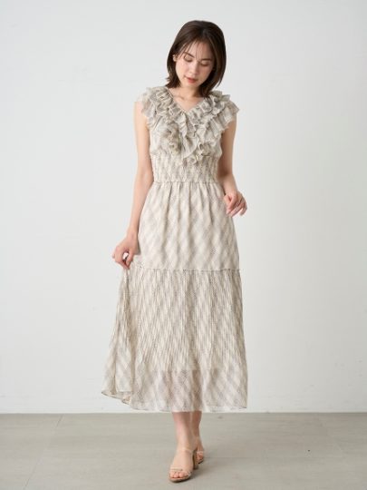 肩から胸までボリューミーなフリルをあしらって、上品さとかわいさを同時に演出♡肩上のフリルがさりげなく二の腕をカバーしてくれます。ふんわりとした質感ですが、スカートは広がりすぎないシルエットに設計していて落ち着いた印象に。