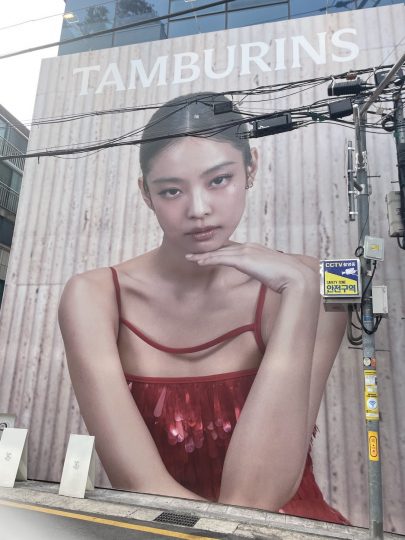 地下鉄の新沙駅8番出口から歩いて10分くらい歩くと、シンプルな白壁に映えるジェニーちゃんの大きな看板が目に入ります!