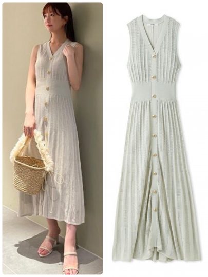 夏に着やすい素材感で仕上げたニットワンピース。袖先と裾はシアーになっており軽さをプラス。顔まわりを華やかに魅せてくれる大きなオーガンジーリボンがアクセントな主役級のワンピースです。細かなリブ編みできちんと感もあるのでパーティーにもぴったり。くすみカラーのミントがおしゃれです。