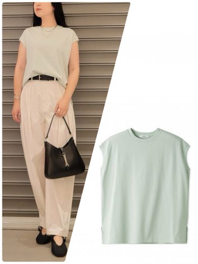気になる肩まわりや二の腕を隠せるフレンチスリーブトップス。Tシャツよりもきれい見えし、ジャケットとの相性も良い為、オフィスシーンにも着用できます。ノースリーブのようにIラインを作りながら、身体のシルエットをさりげなくカバーできるのが着やすいポイント。着心地の良いカットソー地を使用、差し色にもなるミントがおすすめです。