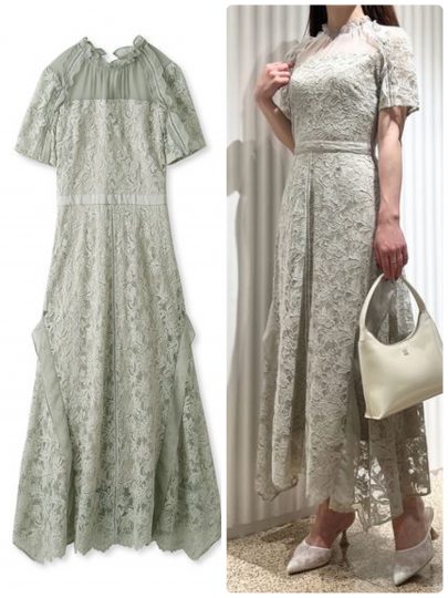 美シルエットなレースドレスも、スモーキーなミントカラーで差をつけたい。デコルテ周りはシフォン生地に切り替えて、品のいい肌見せが叶うデザインです。襟ぐりのシフォンフリルが顔まわりを華やかに見せてくれます。スカート部分にはサイドにシフォンフリルをあしらってさりげないフェミニンなアクセントをプラス。