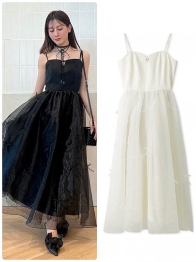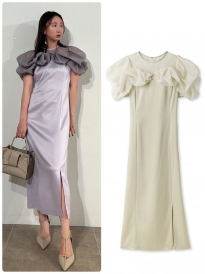 フィット&フレアのシルエットがドラマティック♡フロッキードットの生地と無地のオーガンジー素材の2種類の生地を重ねて、ふんわり感たっぷり。