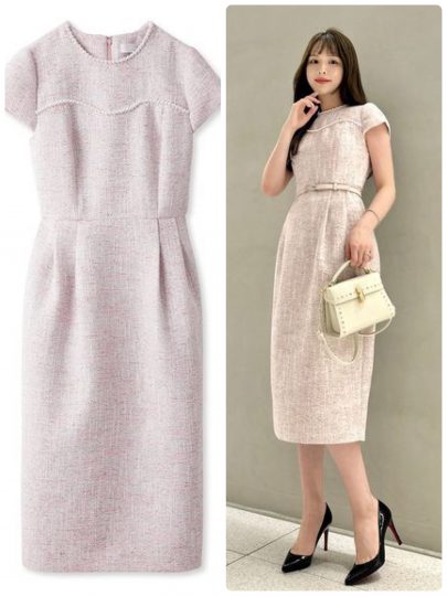 纏った瞬間からクラシカルレディな印象に導くピンクのツイードワンピース。胸元のパールが上品で可愛らしいイメージに。小物を白黒でまとめると、子供っぽくならずにきれいめに仕上がります。