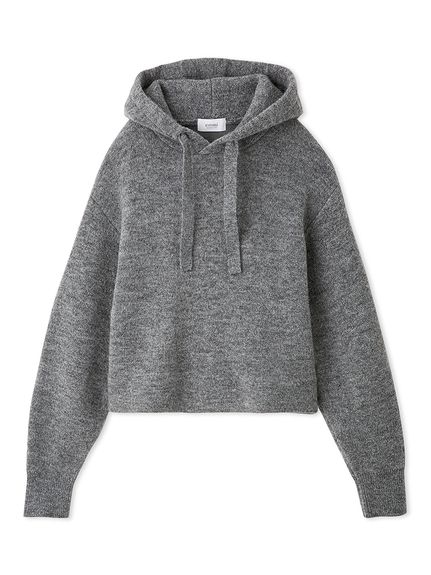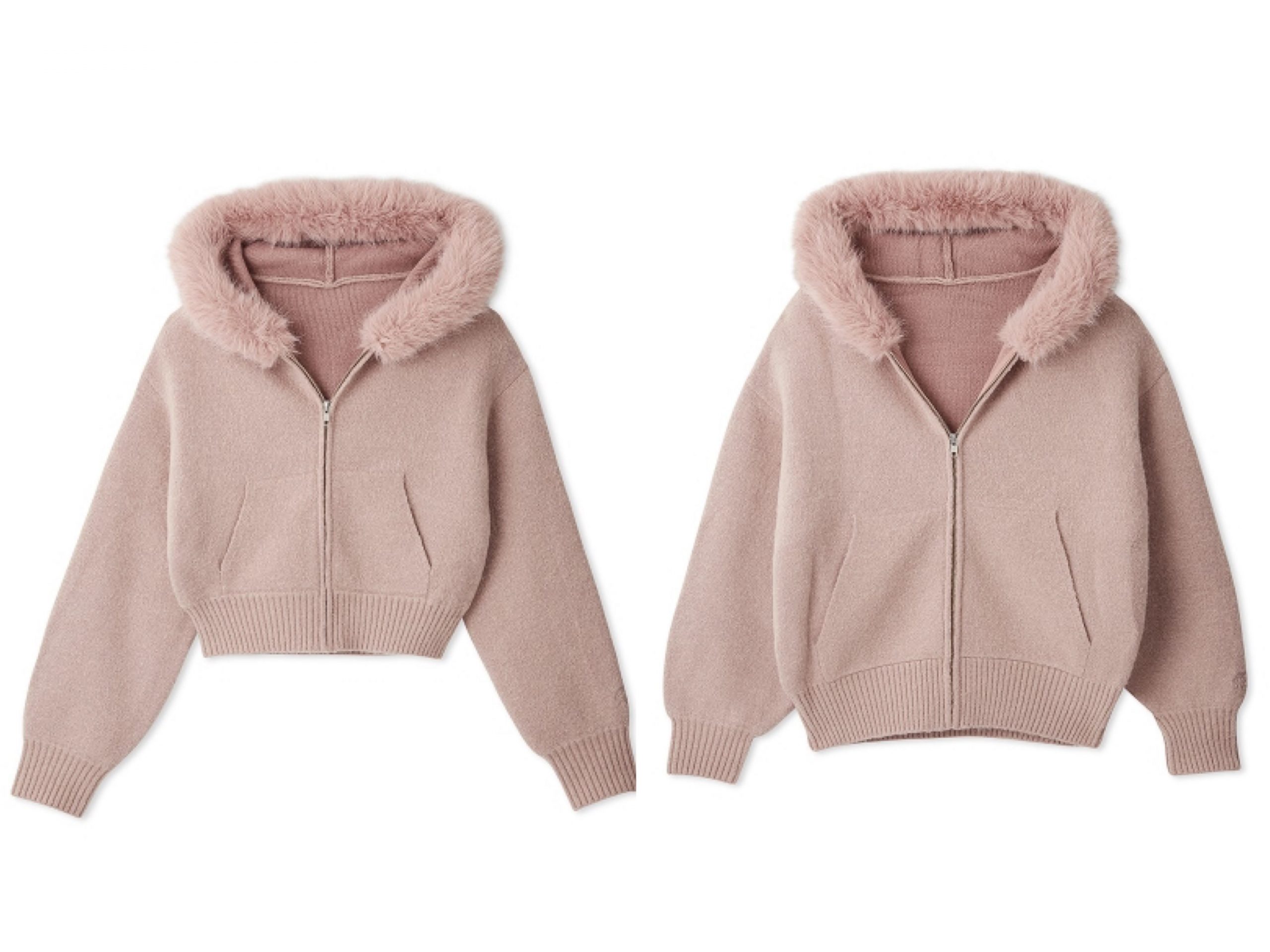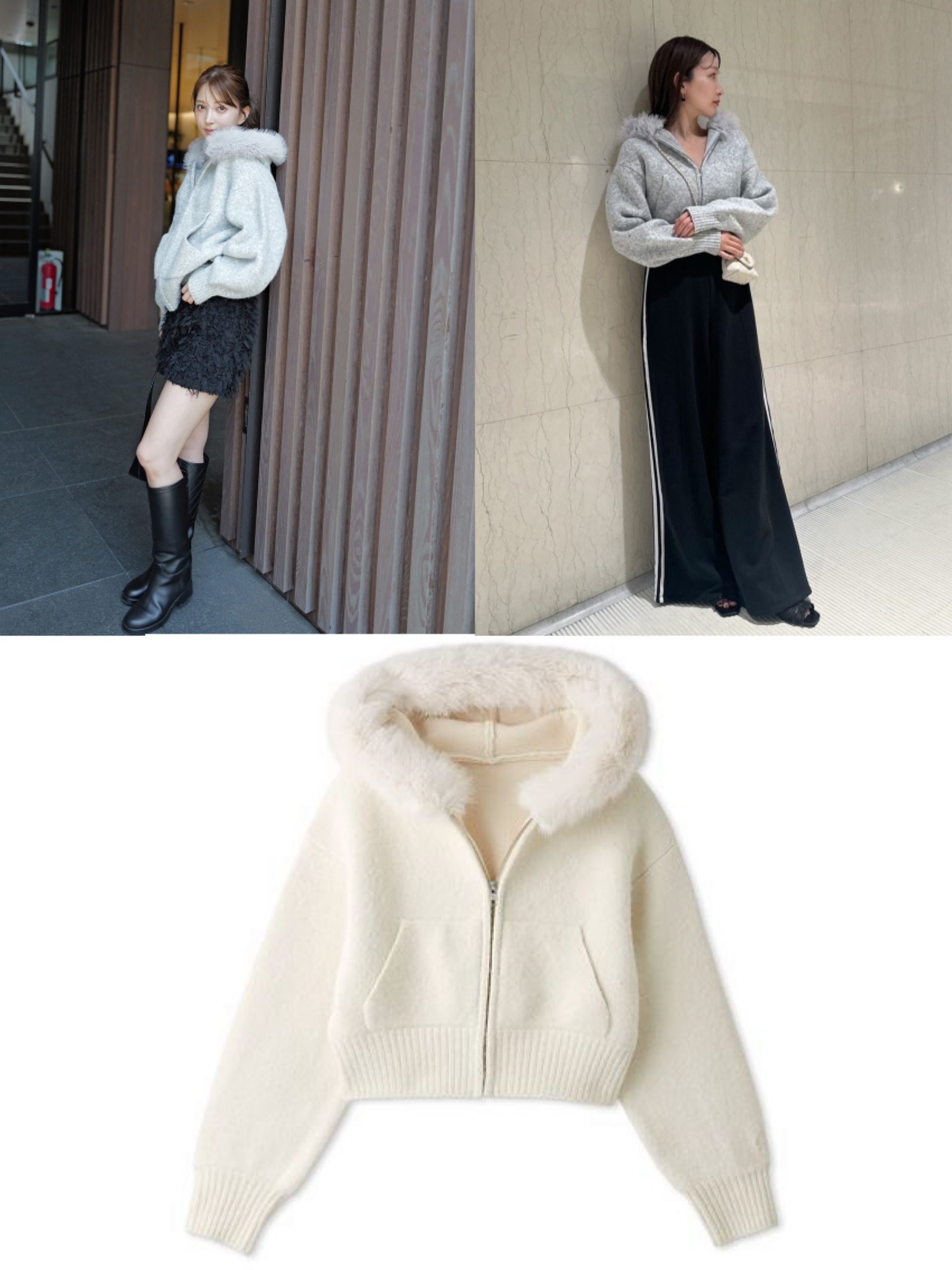 目の詰まった厚手ニットをベースにした、ファー付きパーカ。サイズ0と1でかなり丈感が異なります。
