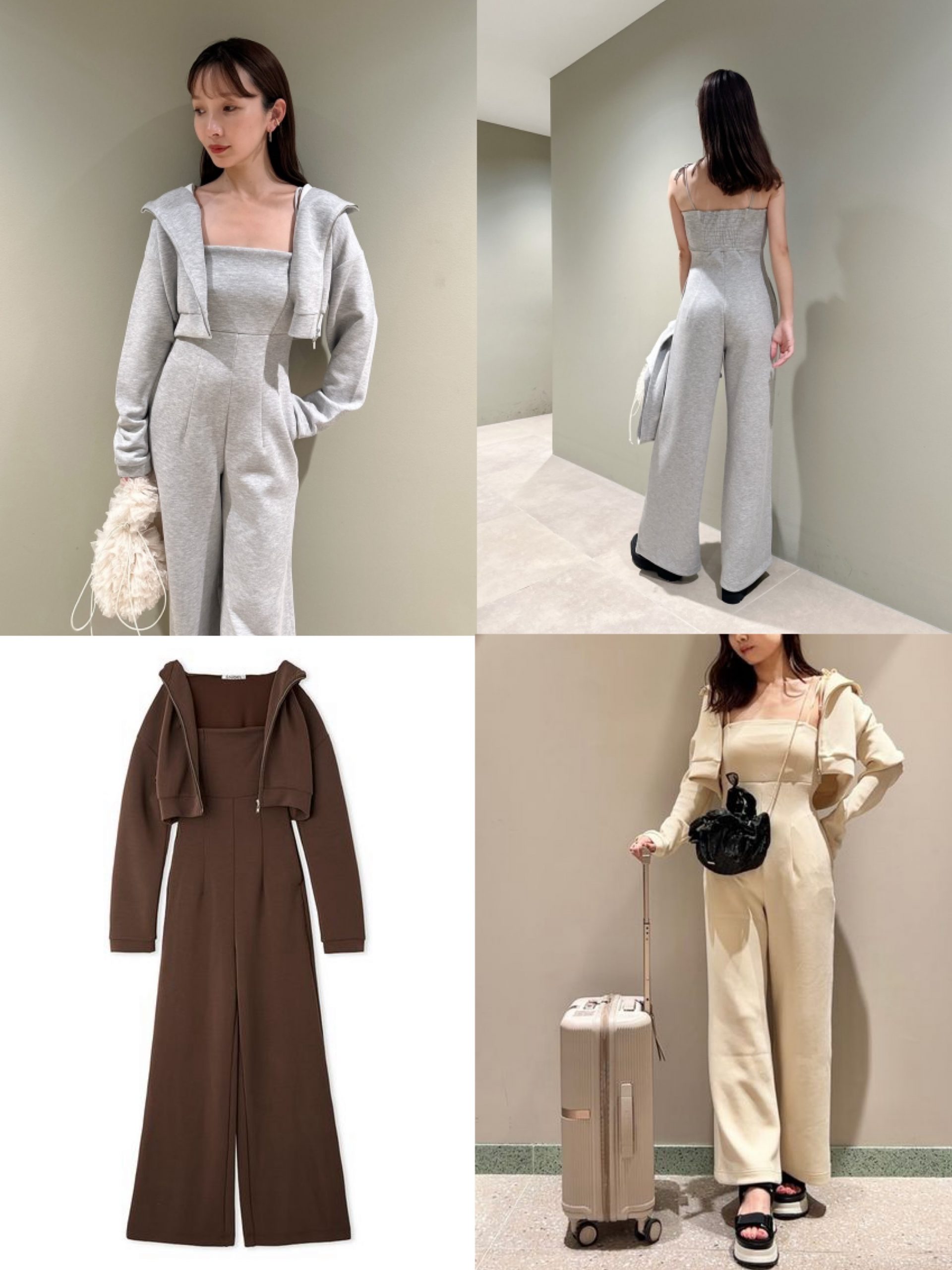 スタイル良く見せてくれるオールインワンの肩紐は取り外すことも可能。リラックス感のあるデザインは、韓国のセレブリティーの旅先コーデのような雰囲気。カットソー素材なので、着心地も抜群。