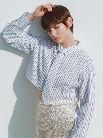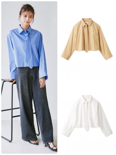 正統スクールコーデが叶う、パリッとした素材のネクタイ付きクロップドシャツ。コンパクトな身頃とタックで膨らみを持たせた袖で、女性らしく着られるシルエットです。ネクタイはフックで取り外しができるので着脱も簡単。自分で結ぶ手間もなく、手軽にプラスオンが楽しめます。