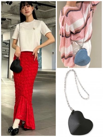 キャッチーなハート型が着こなしのアクセントにぴったり。ブラックはフェイクレザー、ブルーはデニム地です。