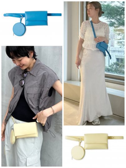 取り外せる四角&丸のポーチが並んだベルトバッグ。斜め掛けでも腰に巻いてもOKのマルチなアイテムです。