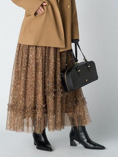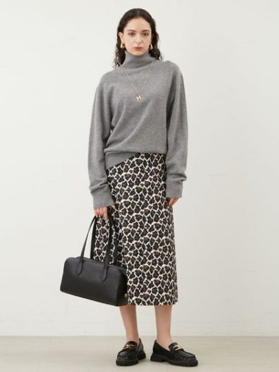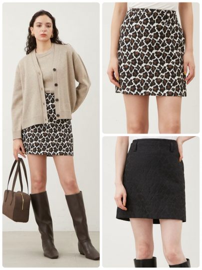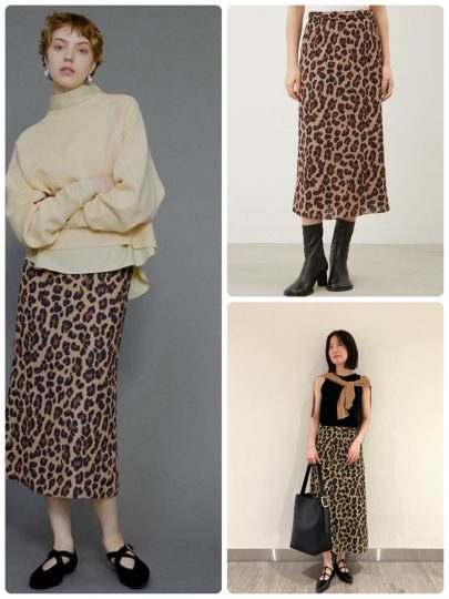 エレガントなナロースカートにレオパード柄をオン。上品シルエットと感度の高い柄のギャップがポイントです。きれいめな見た目でもウエストはゴム仕様のため、らくちんな着用感。そしてブーツとも相性がいいので、秋から冬まで長く活躍してくれそうです。