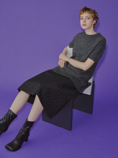 今季トレンドのミニ丈スカート。程よい長さに設計しているので、大人もすんなり受け入れられるはずです。体型を気にせず着用していただけるボックスシルエットもポイント。