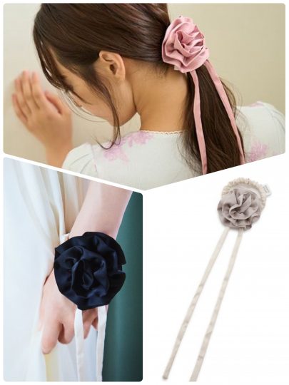 サテン生地のローズコサージュをアクセントにした、ロングリボン付きのシュシュ。リボン部分は取り外し可能。髪につけるだけでなく、首や手首に、アクセサリーがわりにあしらっても今っぽくて素敵。