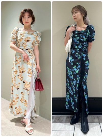 野に咲くバラのような甘さの中にエッジが宿る、LILY BROWNオリジナルプリントワンピース。サイドから裾にかけてギャザーを寄せ、シフォンのラッフルをのぞかせたアシンメトリーなデザインが特徴。あえて裾からもシフォンをのぞかせることで、動く度に足元を彩るセンシュアルな印象を表現しています。