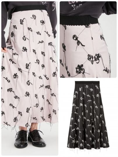 Artist Tappei氏が描き起こした、オリジナルのバラ柄を刺繍。個性的な柄ながら、シンプルなフレアシルエットなので、コンパクトサイズのニットなどと合わせると大人っぽく決まります。