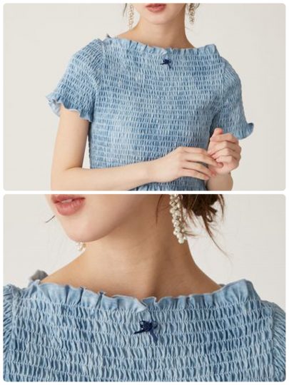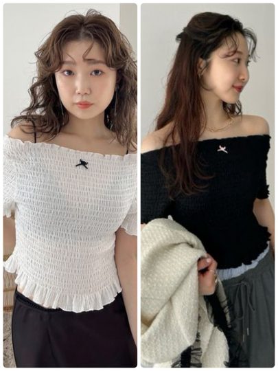 シャーリング仕立てのコンパクトトップスは、胸元に小さなローズ&リボンモチーフをトッピング。身体にフィットするシルエットは着心地も抜群で、しっかりとメリハリをつけくれるので着痩せ効果も期待できます。お腹をちら見せし、ボリュームパンツやデニム、ミニボトムスと合わせると旬なスタイルが完成します。