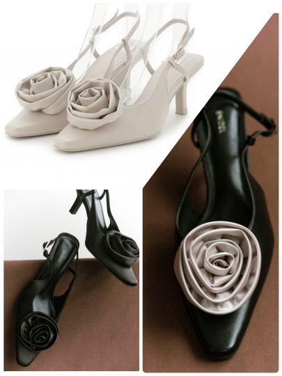 立体的なローズモチーフをトッピングしたパンプス。オケージョンシーンやデニム合わせでカジュアルスタイルにも合わせやすく、モード感のある仕上がりに。
