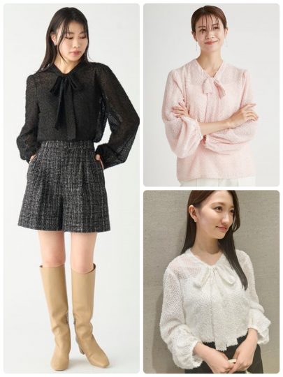 柔らかでほんのり透け感のあるシフォン地とふんわりしたカットジャガードをミックスして仕立てたブラウスです。細めのボウタイを加えて上品さをプラス。手首に向かってボリュームを出したデザインで、二の腕のみといわず腕全体をすっぽり覆ってくれます。