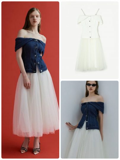 デニムトップス=カジュアルな印象が強いですが、ウエストをシェイプしたデザインで女性らしさ満点に。セットのチュールスカートと合わせてワンピース風に着こなすほか、それぞれ単品使いするのも◎です。スカートはTシャツ、ニット、トップスはパンツやスカートに合わせるのもおすすめ。