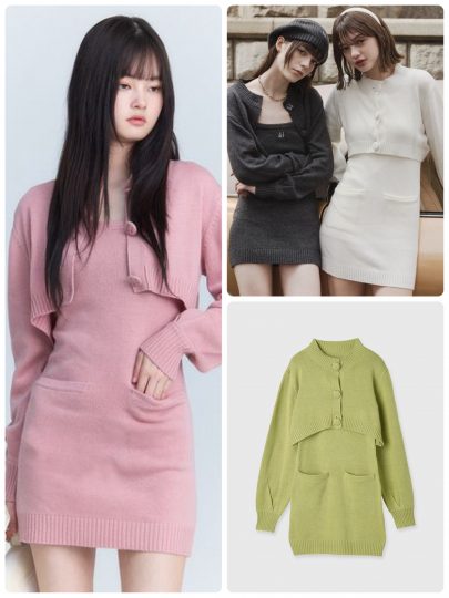 ボディラインにフィットするシンプルなミニ丈ワンピースとニットカーディガンのセット。カーディガンは旬のクロップド丈で今っぽさを演出してくれます。大きめのボタンもポイント。また、ワンピースにポケットを配したことで脚長に視覚操作も可能です。