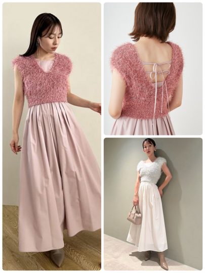 毛足の長いファー調のニットベストとキャミロングワンピースのセット。ウエストにタックを施して、ドラマティックなフレアシルエットにお作りしたワンピースの背中側にはリボンをプラスしてバレエコアな味付けを♡ベストを重ねても、こちらのリボンはしっかり見える仕様です。
