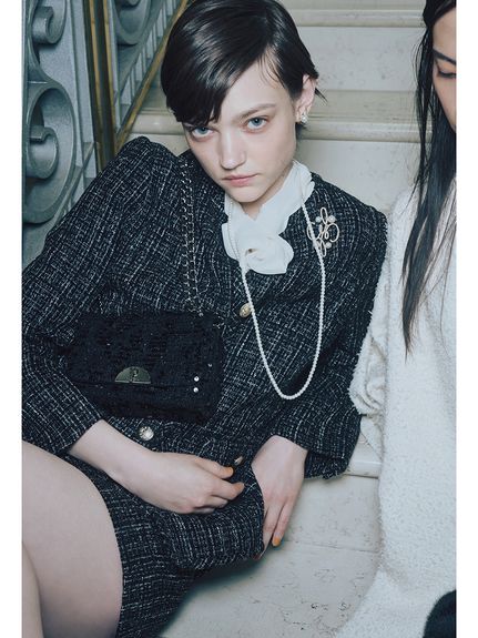 パーティーシーンにも自信を持って参加できる、上品なジャケット。パールなどのアクセサリーとの相性も抜群。パイピングツイードジャケット¥28,600/CELFORD