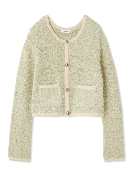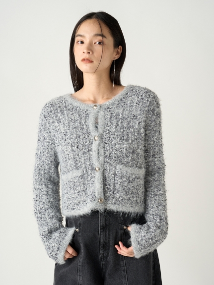 形はかなり上のLILY BROWNのジャケットに似た、ニットカーディガン。ニットで毛足の長い生地を使っているので、印象柔らか。こちらも再販系なのでお早めに。着丈39cm。ラメツイードニットカーディガン¥16,500/SNIDEL