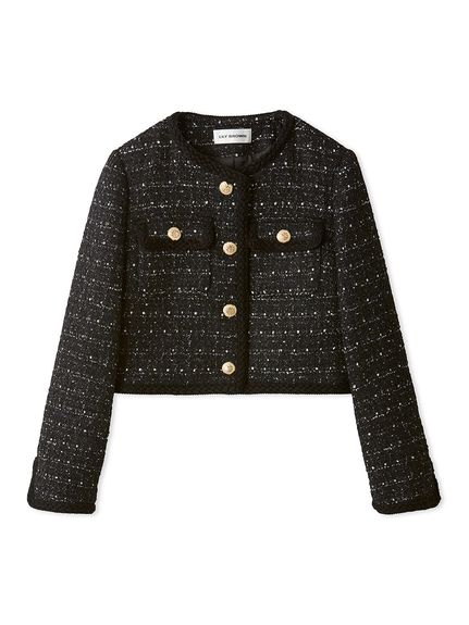 短め丈の、LILY BROWNの再販ジャケット。しっかりした造りなのに、このお値段。買いです。現在、このブラックのみが手に入ります。形はかなりコンパクト。着丈44cm。ツイードジャケット¥13,970/LILY BROWN