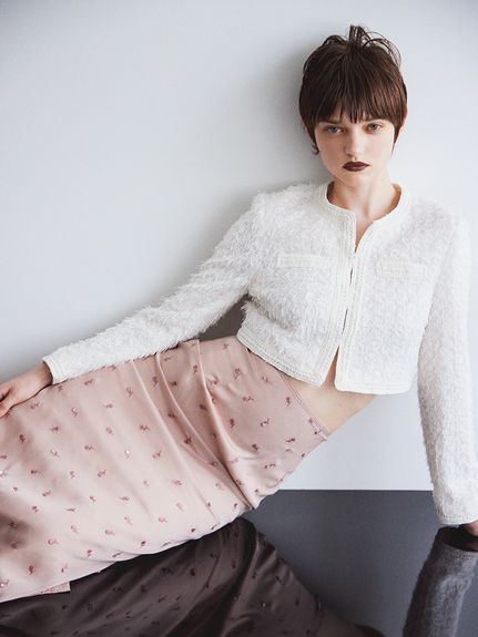 着丈40cm前後の、チラチラお腹出るタイプのショートジャケット。ハイウエストボトムと合わせて、華やかに。テクスチャーショートジャケット¥20,900/SNIDEL