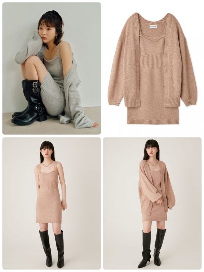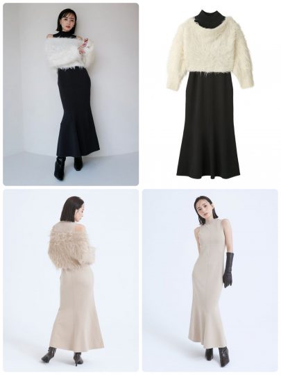 ふわもこのシャギートップスにマーメイドニットワンピをレイヤード。このセットで素材、シルエットとトレンドを完全網羅♪