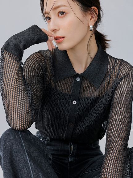 アニュアンスのポロはメッシュで出来ているので、センシュアルで可愛く着られるのが特徴。ハーフスリーブバージョンも大人気のため、ほぼ完売。ラメメッシュニットポロシャツ/アニュアンス