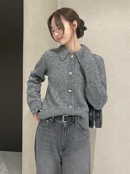 キラキラなビジューボタンがついた、こちらはざっくりとした編み地がカジュアルな1枚。主にはカーデとして使うアイテムですが、写真のように全てボタンを閉めて着ると、今っぽい雰囲気に。ビジューボタンポロニットカーディガン/ミラオーウェン