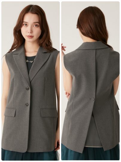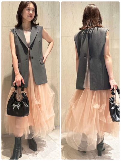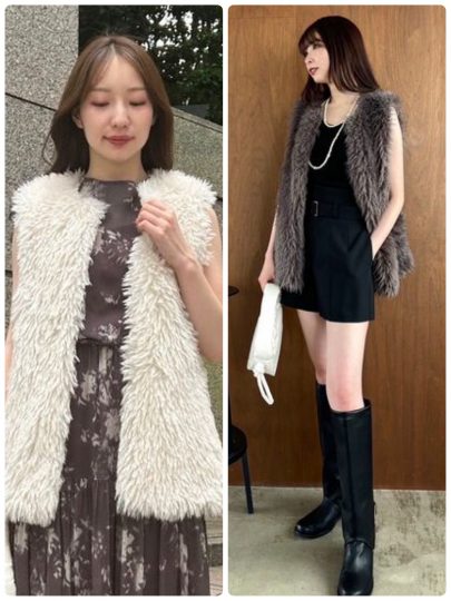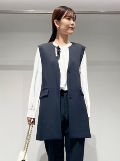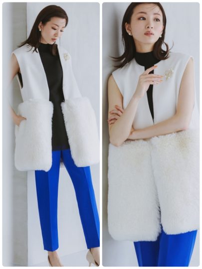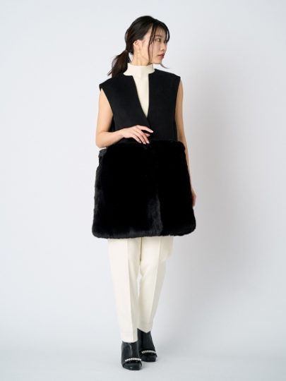 コート地とファーがドッキングされたような、ロング丈のジレ。裾にポイントがある分、襟ぐりはvネックにし、シルエットはすっきり。エレガントさとキャッチーな愛らしさのあるデザインが特徴です。パンツスタイルにはもちろん、レイヤード次第でワンピースのような着こなしもおすすめです。