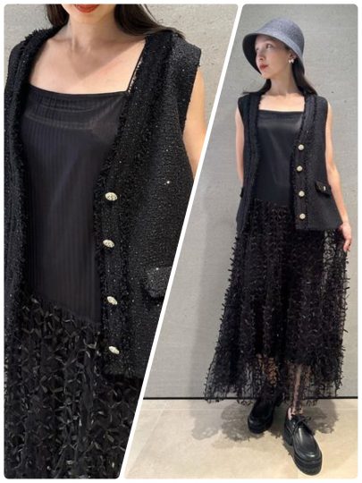 SNIDELオリジナルのツイード生地で作った華やかなジレ。スパンコールやラメ糸を混ぜてさりげなくきらめきをプラス。前立てにはフリンジを施し、立体的なゴールドのボタンをオン。腰回りは立体感のあるパターンで仕上げ、程よく身体にフィットして美シルエットラインを描きます。
