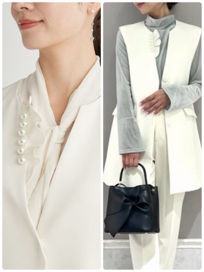 バックスリットのボタンを留めればややウエストシェイプされたシャープな印象に、開ければボックス型のマスキュリンな印象にと、着こなしにあわせた異なる表情を魅せてくれます。肩には異素材のシアー素材を重ね、モード感のある旬なディテールが鮮度をUP!