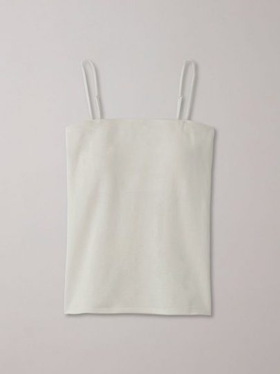 カップ付きなのでブラストラップの存在に悩まされず、レイヤードコーデを楽しむことが可能。胸の谷間をさりげなくカバーしてくれるのでヘルシーな印象に仕上がります。こちらの付属のストラップは取り外しできるので、首周りが開いたトップスでも安心。3サイズ展開です。