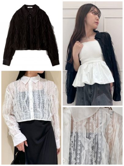 前開けで羽織りとしても、ボタンを留めてトップスとしても使えるシャツ。レース地にチュールフリルをあしらって奥行きをプラス。