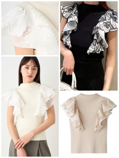 肩を囲むように大ぶりフリルをあしらった、着映え力満点なノースリニット。エンブロイダリーレースが目を引きます。