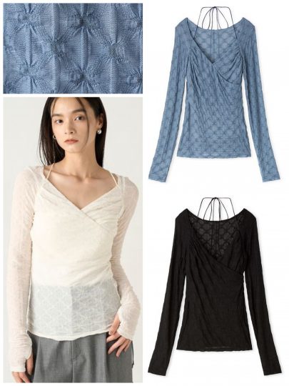 伸縮性のあるレース素材はタイトながら着心地◎。カシュクール面を後ろにしたり、首元リボンの結び方を変えたりと、アレンジ自在です。