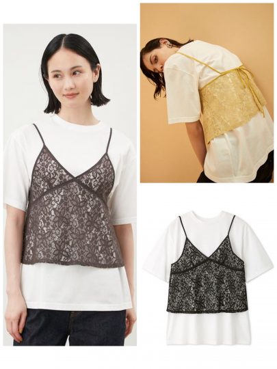 カジュアルな白Tに、センシュアルなレースビスチェをレイヤード。背中をリボンで結ぶ仕様でバックスタイルまで抜かりなく。