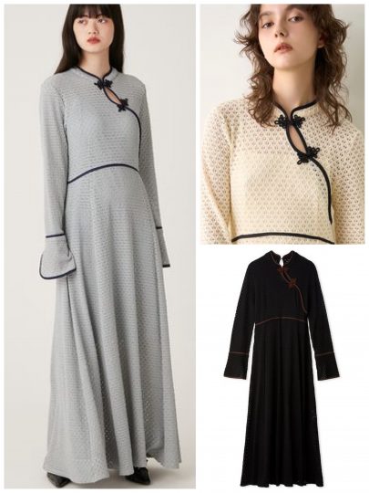 エッジの効いたチャイナ風ディテールなら、総レースでも甘さ控えめ。パイピングとボタンの配色使いでメリハリよく。