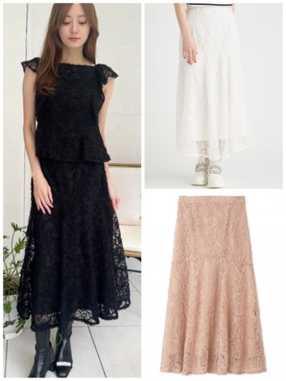 高め位置で切り替えたマーメイドスカートは、ふんわり広がるシルエットがキレイ。繊細なレースでコーデ全体が華やぎます。
