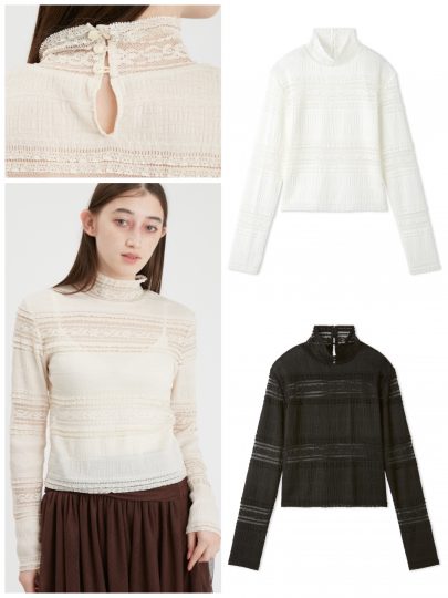 ボーダー状に切り替わったレースからほんのり素肌が覗くデザイン。首後ろにボタンの付いたハイネックでクラシカルに。