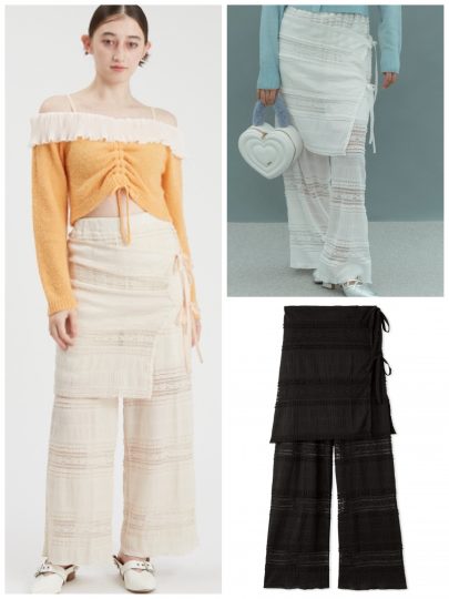 ウエストゴムのパンツ+ラップスカートの重ね着が今っぽいSET。リラクシーなフォルムがレースの甘さを適度にオフしてくれます。